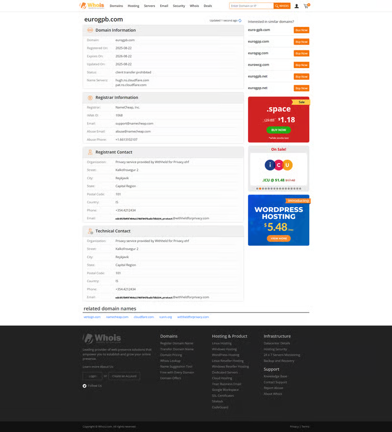 According to WHOIS records, eurogpb.com was registered on August 22, 2025, and updated on the same day. From a domain lifecycle perspective, the platform’s web presence is relatively new and lacks long-term historical visibility.
