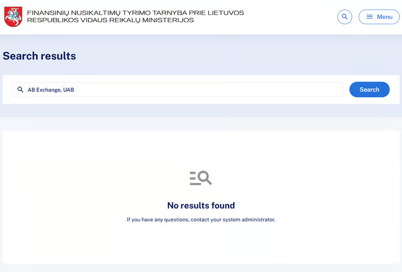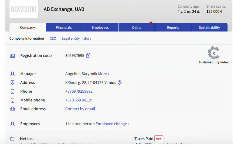 In the Lithuanian corporate registry, AB Exchange, UAB (305937695) can be found, including registration status and a registered address. This indicates that the company name and number correspond to a real corporate entry.
