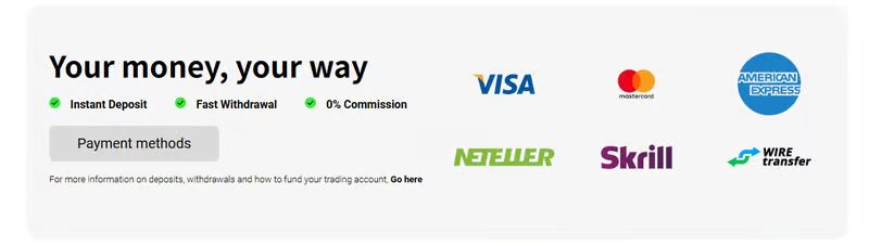 The platform claims to support VISA, Mastercard, American Express, NETELLER, Skrill, and wire transfers. While this suggests broad funding options, it does not confirm actual availability by region or account status.