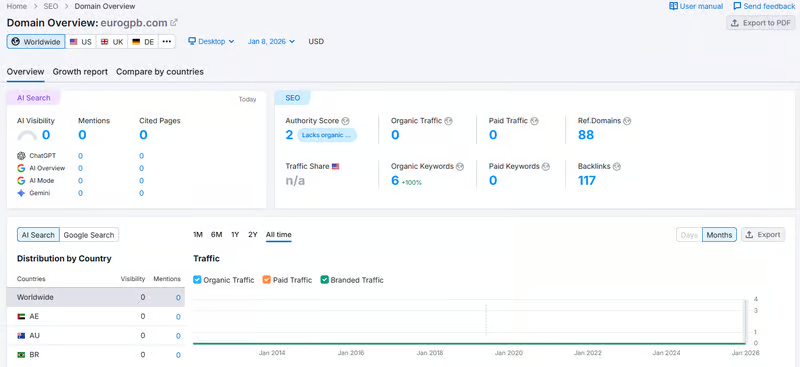 According to Semrush data, eurogpb.com has nearly zero monthly traffic, indicating extremely low search visibility and minimal public reach. This suggests the platform may not yet have a meaningful organic user base, at least in terms of measurable public traffic signals.